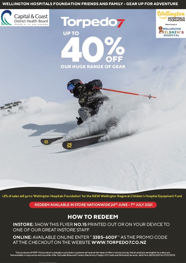 Friends of Wellington Hospitals Foundation can enjoy discounted prices at Torpedo 7 stores nationwide between 24 June - 7 July, with up to 40% off selected items. With a portion of all proceeds going to the Wellington Hospitals Foundation for your New Wellington Regional Children’s Hospital, be sure to be in quick to grab your winter essentials.
