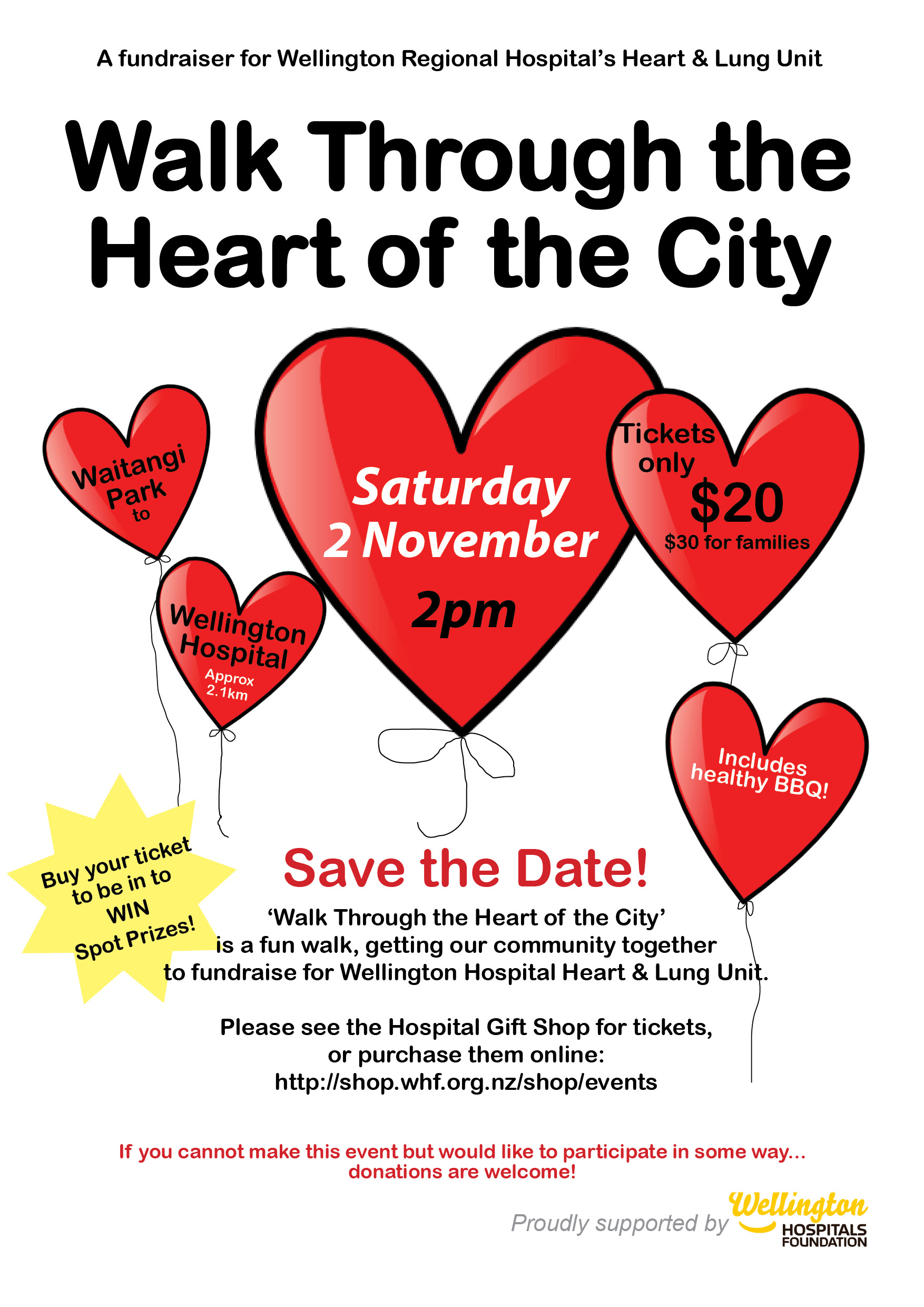 Grab your shoes and loved ones and join us for a fun walk through the heart of the city to build a stronger heart for Wellington Regional Hospital! All funds raised will go towards supporting Wellington Regional Hospital's Heart and Lung Unit. Go the extra mile and encourage family and friends to sponsor you too!