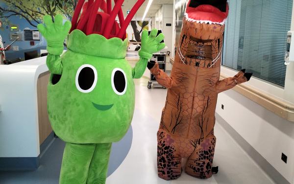 Children’s hospital mascot, Tiaki, had a roarsome surprise when they ran into this fierce (but very friendly) T-Rex – also known as Adele - on their recent visit to Te Wao Nui!