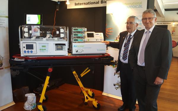 Chair Bill Day and radio personality Grant Walker inspect the first incubator at the recent Neonatal conference in Wellington.