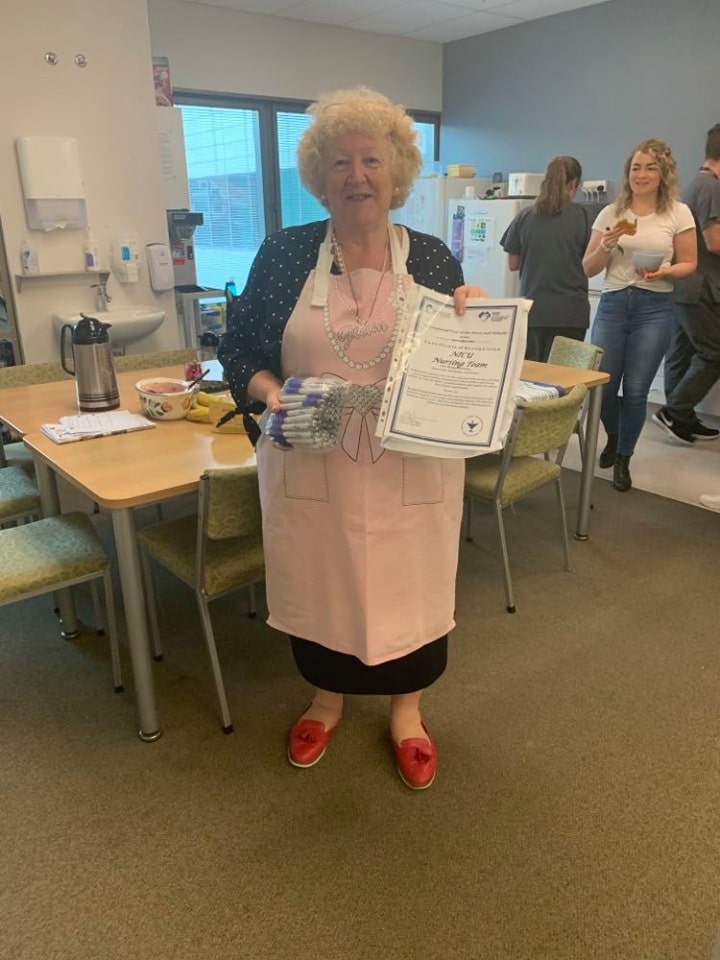 Rosemary Escott with commemorative pens for the NICU team