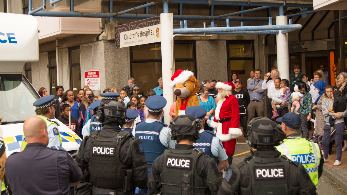 Police cars lined up outside the entrance to the children’s hospital, and members of the New Zealand Police and Armed Offenders Squad delivered the gifts throughout the children’s hospital wards. Children and staff got to meet the officers, dress up in uniform and check out the inside of the Police cars and mobile Police unit.