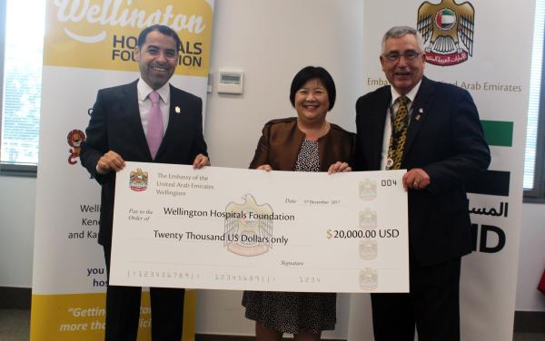 United Arab Emirates new Ambassador to New Zealand His Excellency Mr. Saleh Alsuwaidi today presented Bill Day, Chair Wellington Hospitals Foundation with a cheque for US$20,000 to assist sick New Zealand and Pacific Island children.