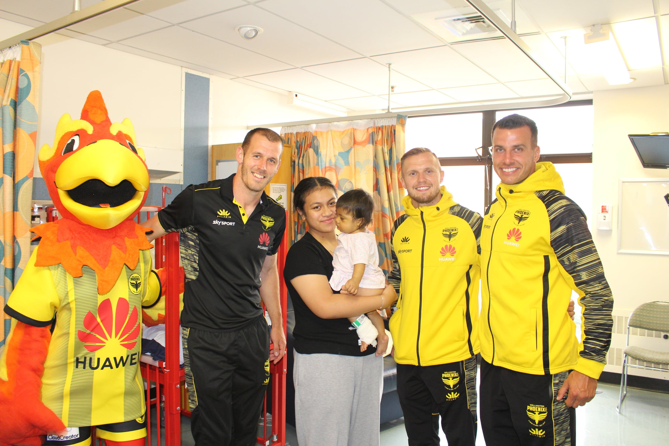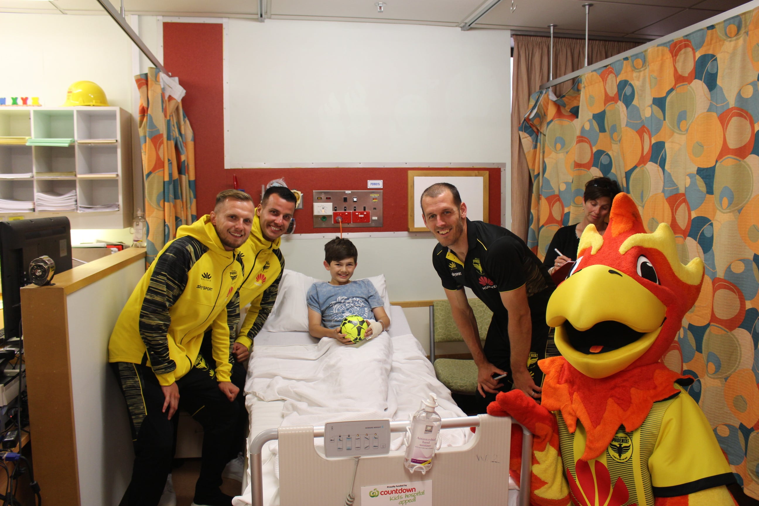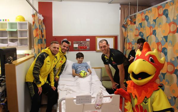 There were sunny smiles all round as Nixie, Steven Taylor, David Bally and Luke Devere, players from the Wellington Phoenix FC visited the Wellington Children’s Hospital yesterday afternoon to spend time with the kids. The signed mini soccer balls also went down a treat! Thanks team!