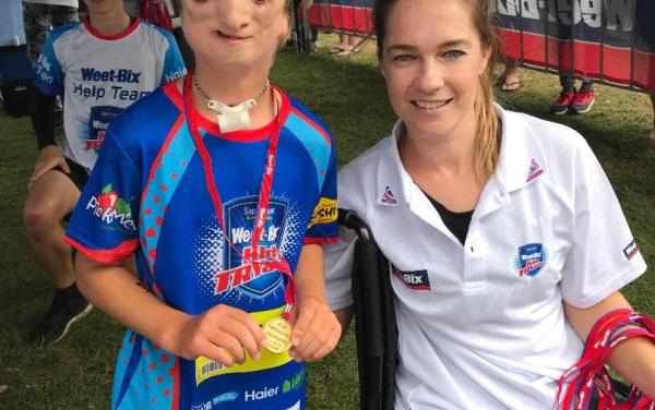 Kobe with Para Olympian Rachel Maia at the New Plymouth Weetbix Tryathalon
